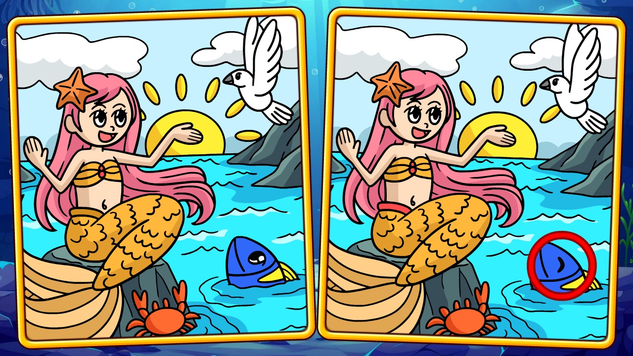 Clique ou toque para revelar diferenças em cenas subaquáticas vibrantes estreladas por sereias e vida marinha! Aprimore suas habilidades de observação e mergulhe na aventura oceânica!